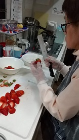焼きあがりました🍰にイチゴと生クリームを添えていきます。