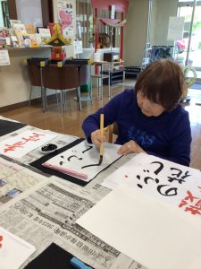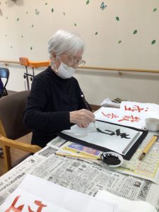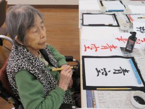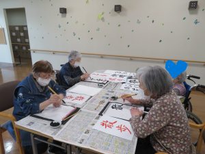 今日のレクは習字です。小学校以来とか普段文字を書かないから手が震える等話をしながら皆さん楽しそうに書いていました。
