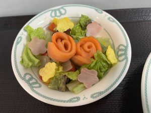 サラダは、お花の形をしたスモークサーモンが目を引く