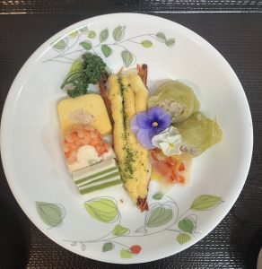 海老テルミドール、ロールキャベツ、テリーヌ3種、チーズサーモン風、パプリカのマリネ、エディブルフラワー、パセリ
