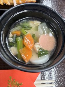 コンソメスープには、じゃが芋、にんじん、コーン、ベーコンが入っています