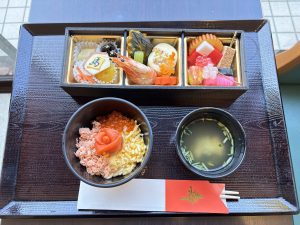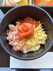 鮭いくら丼には、鮭と錦糸卵、いくら、サーモンフラワーが乗っています🐟