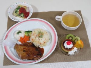🌸キャロットライス🌸ローストチキン🌸スパニッシュオムレツ🌸プリンアラモード🌸コンソメスープ。チキンはとても柔らかくガブッとかみつきました。スパニッシュオムレツはブロッコリーが沢山入って美味しかったです。