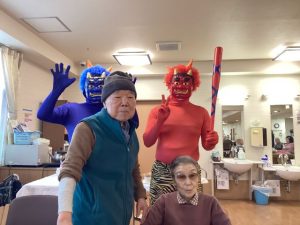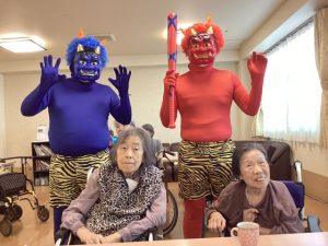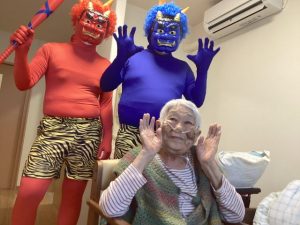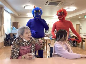 アーバンリビング稲毛では、鬼に扮した職員が入居者様のもとに襲来する節分レクを行いました👹